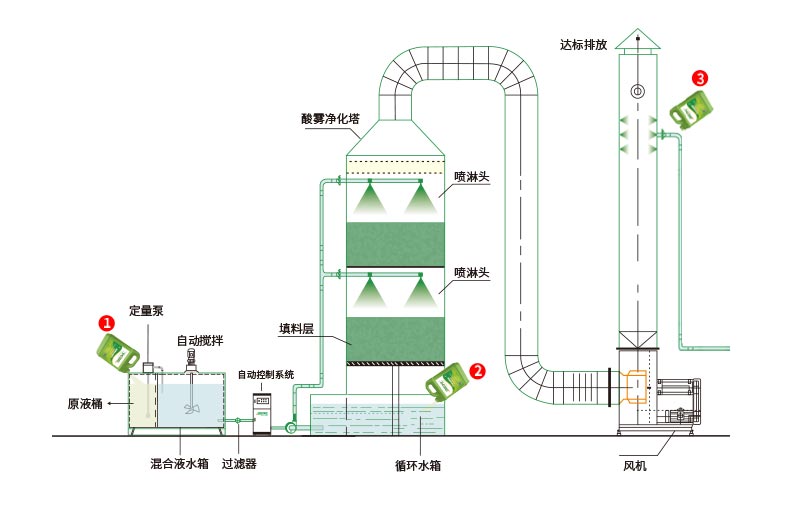 將“的凈”工業(yè)除臭劑加入噴淋塔循環(huán)水箱,通過噴淋頭霧化后除臭
